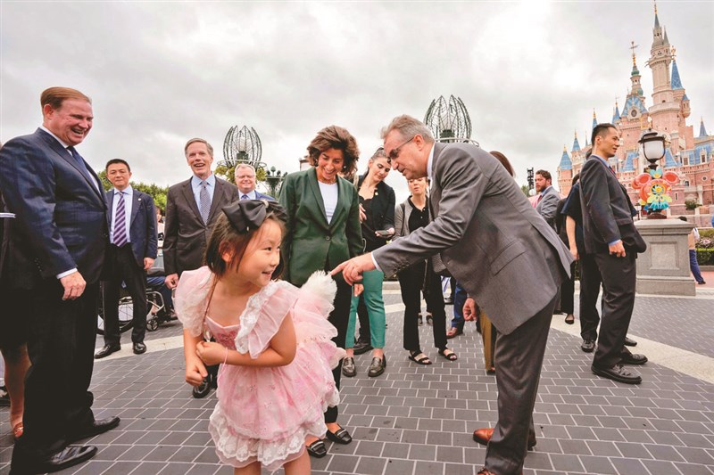一名身穿LinaBell角色服裝的小女孩,三十日在中國大陸上海的迪士尼樂園,向美國商務部長雷蒙朵(中)展示衣服上的尾巴。圖/美聯社