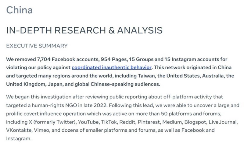 反制大陸大外宣無用訊息 Facebook刪逾7700帳號 |2023.08.31 語音朗讀 1350觀看次 字級 大 中 小 美國社群媒體平台Facebook的母公司Meta宣布,已刪除7700多個臉書帳號,這些帳號涉及中國一項大規模線上垃圾訊息行動。示意圖/unsplash 【本報綜合外電報導】美國社群媒體平台臉書(Facebook)的母公司Meta宣布,已刪除7700多個臉書帳號,這些帳號涉及中國大陸一項大規模線上垃圾訊息行動,試圖偷偷宣傳中國並批評西方。法新社報導,根據Meta提出的威脅報告,中國大陸這項被人稱作「垃圾訊息偽裝」(Spamouflage)的行動,活躍於50多個社群媒體平台和網路論壇,包括Meta旗下的臉書和Instagram(IG)、中國字節跳動公司推出的TikTok、谷歌(Google)母公司Alphabet擁有的YouTube,以及舊稱推特(Twitter)的X。Meta全球威脅情報事務主管尼莫(Ben Nimmo)表示:「我們估計,這是我們所知今日世界上範圍最廣、產量最多的暗中影響力作戰(又稱認知作戰)行動,不過並未成功。」Meta總部。圖/美聯社尼莫還說:「我們持續能夠確認,這項垃圾訊息偽裝行動,與中國執法單位有關聯的個人掛鉤。」Meta一舉刪除了7700多個臉書帳號和15個IG帳號,並形容這是Meta旗下平台史上最大規模單次取締行動。尼莫表示:「這是我們首次能夠把好幾個帳號群串聯起來,證實它們全都屬於同一個行動。」Meta的報告寫道,這個垃圾訊息網絡通常會發表稱讚中國和新疆的貼文,並且發文抨擊美國、西方外交政策和批評中國政府的記者與研究人員。根據報告,這項行動是從中國發動,鎖定地點包括台灣、美國、澳洲、英國和日本,以及全球華語受眾。Meta提出的威脅報告提到,已刪除7700多個臉書帳號。圖/取自Meta網頁about.fb.com不過,Meta的團隊表示,這個網絡獲得的互動似乎很少,留言的人也傾向指出不實說法。Meta還指出,這些假帳號群的經營者位處中國不同地區,帳號活躍時間強烈暗示是一群人在辦公室每日依上班時間操作。尼莫表示,中國使用的一些手法,類似2019年被揭穿的俄羅斯網路假訊息操作,暗示雙方可能互相學習。 前一篇文章 拜登動用總統撥款權 首度對台「外國軍事融資」 下一篇文章 恍神逾30秒 美參院共和黨領袖健康引關注 熱門新聞 01【詩】 鐮刀俠2026.04.2102勞動部將研議 勞退舊制移入新制2026.04.1803普門寺愛書人行佛 探討社會議題 2026.04.1804佛光山開山60周年 傳授三壇大戒2026.04.2005南投補助洗冷氣 估減碳排3.3萬噸2026.04.1806用說話鍛鍊大腦2026.04.18072026地球日 行動永續綠色未來 2026.04.2208【營養專欄】外食族必學:補菜四策略2026.04.1809氣候變遷 牽動美年輕人生育觀2026.04.1910永和學舍慶佛誕 千人浴佛清淨身心2026.04.22 訂閱電子報 台北市 天氣預報 台灣一週天氣預報 相關報導 參議院聽證會 Fed主席提名人華許 避答獨立性議題潦草小狗 現身上海川普延長停火1天 美伊重啟談判印度大城 暴雨成災日青森外海極淺層7.7強震 2傷美動武扣押伊朗貨輪 談判恐生變