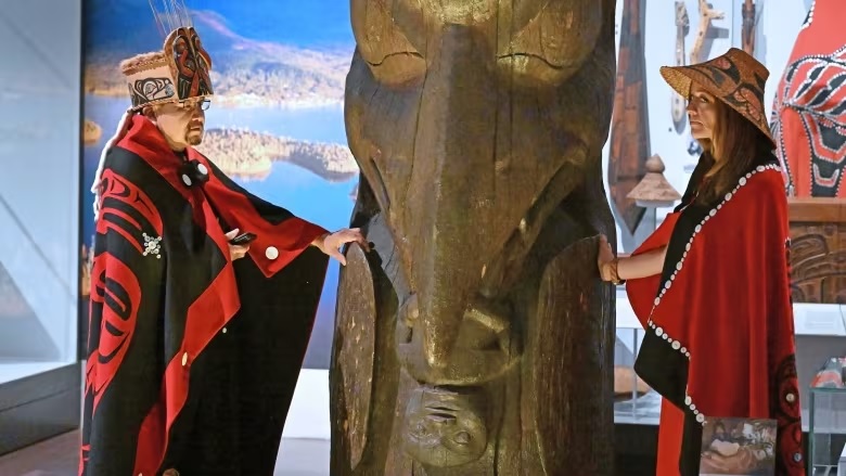 尼斯加部落的酋長史蒂文斯(左)身穿傳統服飾觀賞尼斯加圖騰柱。圖/取自CBC網站