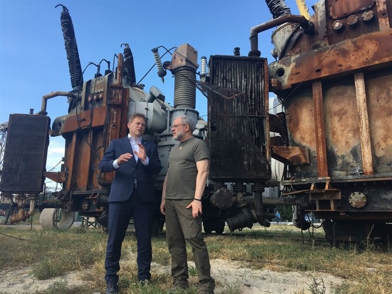 英國能源安全大臣夏普斯(左)31日接任國防大臣。圖為他22日訪問烏克蘭期間,與克蘭能源部長加盧申科(German Galushchenko)參訪遭俄軍摧毀的發電廠。圖/英國政府提供