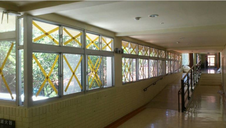假若家裡的門窗不是選用相對較堅固的強化、膠合玻璃,就要記得選用比一般封箱膠,或透明膠帶更具有伸縮彈性、軔性的膠帶,以「X」字型(對角線交叉)或「米」字型黏貼在門窗上,以增加玻璃的支撐強度,膠帶要貼出窗框外,支撐性會更佳。但膠帶只能減緩玻璃碎裂、飛散;若遇強風吹襲作用仍有限,至少能防止破裂玻璃飛散造成危險。