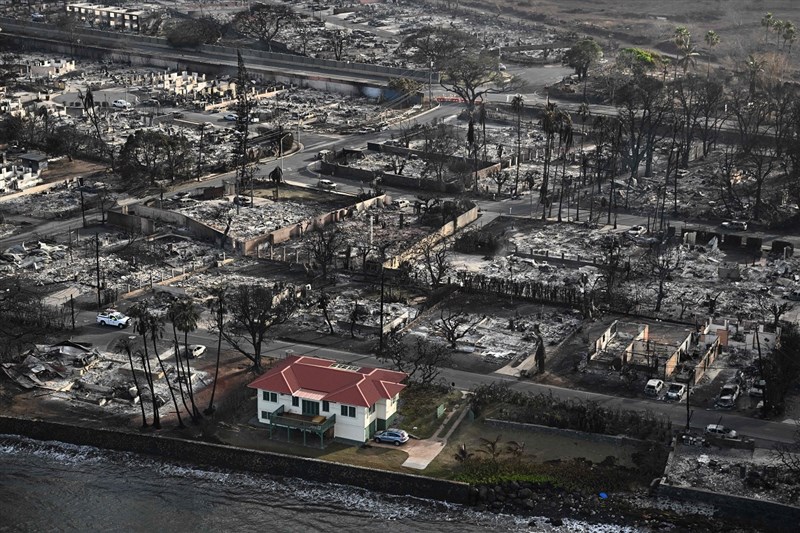 美國夏威夷州茂宜島野火燒毀拉海納鎮,但網路上瘋傳的照片卻顯示,有棟紅色屋頂的房子毫髮無傷,跟周圍廢墟成了鮮明對比。圖/法新社