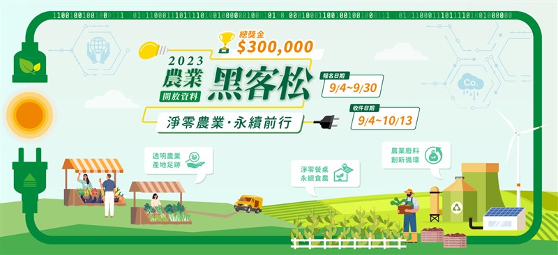 【記者吳亭頤台北報導】「2023農業開放資料黑客松」於9月4日開放報名,為農業部首屆運用開放資料的大型競賽活動,農業部說明,今年競賽主題以「淨零農業,永續前行」為主軸,提供高達30萬元的總獎金,獲獎隊伍的提案內容還有機會落實於農業部政策執行。