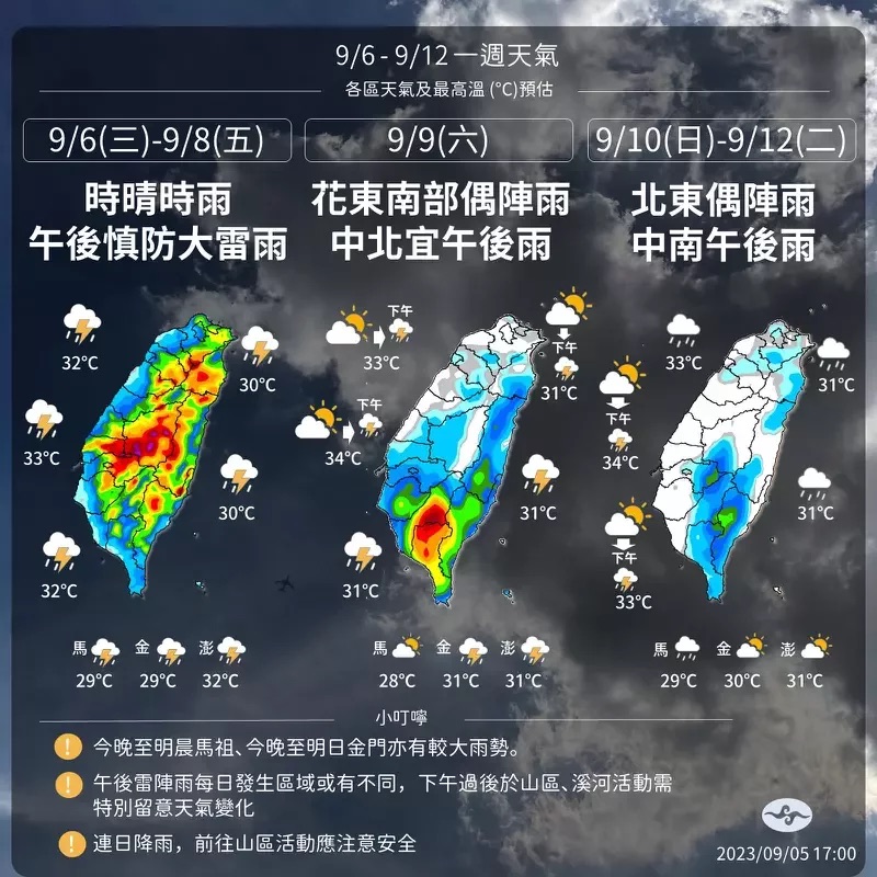 他提醒,海葵颱風雖遠去,也在今天上午減弱為熱帶性低氣壓,但在周三至周五,台灣處大低壓帶中,水氣甚至會更多,天氣不穩,除了南部、花東有迎風面的短暫陣雨與雷雨,其他地區短暫陣雨機率也高,尤其中南部地區、東半部地區、其他山區,午後對流發展旺盛,留意局部大雨或短延時豪雨,並伴隨強陣風出現。