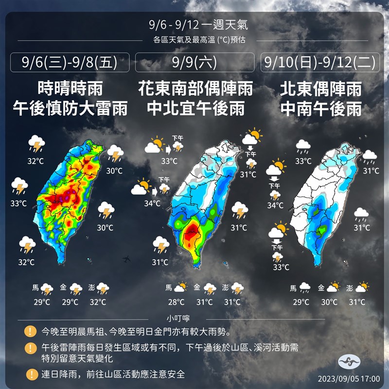 中央氣象局提醒,特別留意午後雷陣雨發展旺盛,配合熱力作用下,預估中南部、東半部地區及各山區容易有局部大雨或豪雨發生,伴隨雷擊及強陣風,下午外出活動請特別留意,且降雨時間較長,雨勢可能持續到晚上。