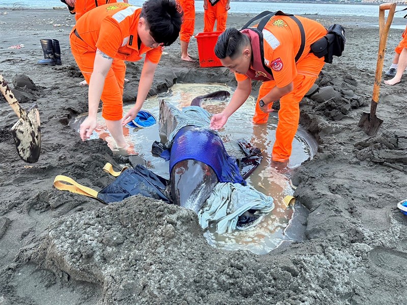 體虛糙齒海豚擱淺八里 療養盼擇期野放 |2023.09.08 語音朗讀 2469觀看次 字級 大 中 小 海巡隊員為糙齒海豚澆水,紓緩牠緊張情緒。圖/新北市動保處提供 【本報新北訊】新北市八里區海域昨(7日)下午5時許,海巡隊員在挖子尾發現鯨豚擱淺,且發現該海豚身體虛弱,動保處通知新北救難協會八里分會動員調派沙灘車,將擱淺鯨豚接駁至中華鯨豚協會卡車,運送八斗子岸置中心安置,待休養、復原再擇期野放。7日下午3時50分左右海巡發現挖子尾附近有鯨豚擱淺,確認為糙齒海豚,體長2.24公尺,為雄性個體,經檢測呼吸每5分鐘13次、心跳微弱,一分鐘45下,持續緊張舉尾,呼吸有漏氣現象,健康狀況不甚理想,因此決定岸際中心做檢查確認。為紓緩海豚緊張情緒,海巡不斷在鯨豚身上澆水,獸醫施打鎮定劑後,天色已伸手不見五指,將鯨豚搬上沙灘車運送接駁,送上卡車載往八斗子安置。糙齒海豚昨(7日)晚安置八斗子岸置中心。圖/新北市動保處提供中華鯨豚協會表示,八里挖子尾糙齒海豚入場後狀態,經獸醫師初步檢查確認動物的心跳與呼吸誠穩定狀態,但心跳力度偏弱、體型消瘦、紅外線皮下檢測暫無異常、雖有浮力但游泳能力還需要評估、個性較敏感且會不時左右擺頭張嘴。後續救援團隊將持續升高收容池水位並確認動物的游動與漂浮能力,並於今上午安排血液檢測、超音波檢測等來評估糙齒海豚的生理健康狀態。新北市動保處表示,新北市東北部、北部及西北部均臨海,不時會有鯨豚、海龜擱淺;民眾若有發現鯨豚、海龜擱淺,可與「海洋保育類野生動物救援組織網」(MARN)聯繫,或通報海巡署或新北市動保處。糙齒海豚擱淺送基隆救援,心跳呼吸穩定盼能回大海。圖/基市府產發處提供 前一篇文章 台中大里飄臭酸味 環保局逮到元凶 下一篇文章 2024年上路 手機回收維修設「循環率」 熱門新聞 01【斗室有燈】老男冒險記2025.11.1402【經典新話】歸亞蕾 超越世代傳奇影后2025.11.1503【詩】遊園地.競馬場2025.11.1704【大師身影】 曲歌繞梁: 弘一大師李叔同(下) 2025.11.1405【營養專欄】掌握五原則 輕鬆控糖2025.11.1506渥太華佛光山 授海狸童軍領巾2025.11.1707佛光山頒三好助學金 鼓勵學生安心學業2025.11.1408法華禪寺 彩繪燈籠2025.11.1509落葉刺繡 巴西百鳥寫真集2025.11.1710【海闊天空】濟州島旅記 解鎖美景美食2025.11.15 訂閱電子報 台北市 天氣預報 台灣一週天氣預報 相關報導 日月潭沒降雨蓄水率增加 水力發電助攻屏東書院園區公告 不能再亂餵鳥類及野生動物 尊重原民文化 七彩湖擬畫保護區盼善意對待海洋 屏東再啟動回收廢漁網計畫要維護生態 丹大地區劃設保護區桃園市復興區櫻花開 罕見「藍喉太陽鳥」現身