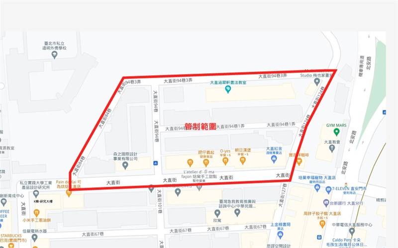 相關管制措施包括大直街以北、大直街84巷以東、大直街94巷3弄以南、大直街124巷以西道路管制人車進出。