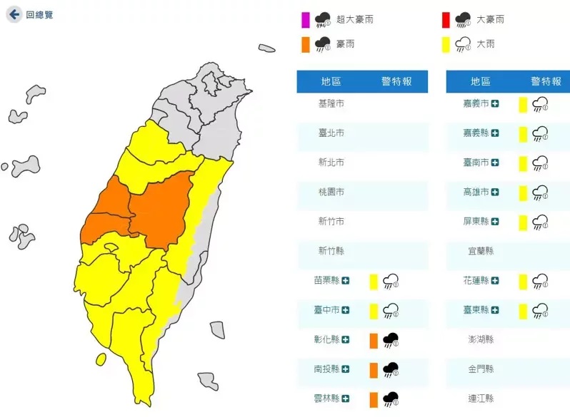 豪雨特報範圍包括彰化縣、南投縣、雲林縣;大雨特報範圍:苗栗縣、台中市、嘉義市、嘉義縣、台南市、高雄市、屏東縣、恆春半島、花蓮縣山區、台東縣山區。影響時間從下午至晚上。