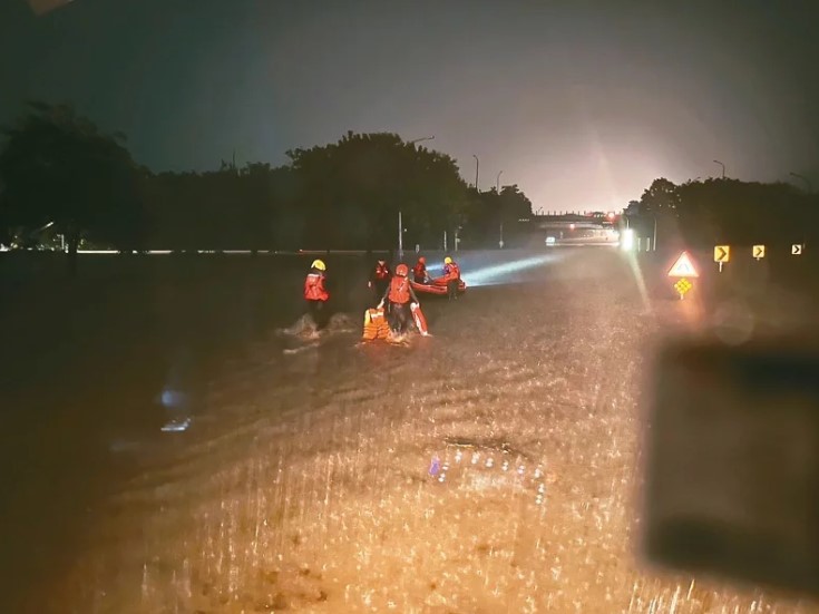 嘉義地區一夜豪雨,多處淹水。圖為嘉義縣永欽二號橋附近多輛車子滅頂,消防員出動膠筏搶救民眾。圖/民眾提供