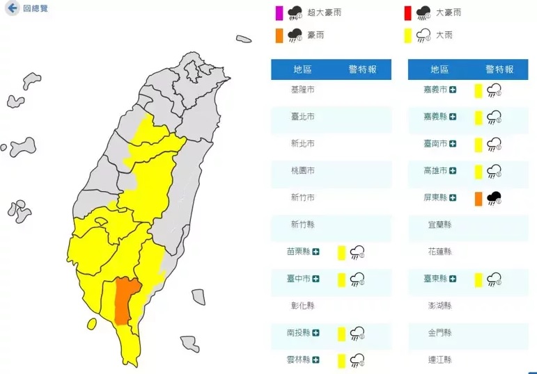 中央氣象局發布豪大雨特報,影響至今晚,豪雨為屏東縣山區,大雨則包括苗栗縣山區、台中市山區、南投縣山區、雲林縣山區、嘉義市、嘉義縣、台南市、高雄市、屏東縣、恆春半島、台東縣山區。