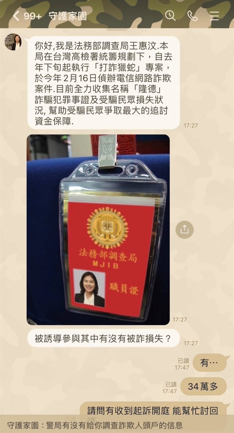 假調查官網路亂竄詐騙 調查局急澄清 |2023.09.11 語音朗讀 1227觀看次 字級 大 中 小 有不法分子在網路LINE群組「守護家園」中,持變造的調查官「王惠汶」服務證,試圖矇騙詐騙案被害人,進行二次詐騙。圖/unsplash 【本報台北訊】有不法分子在網路LINE群組「守護家園」中,持變造的調查官「王惠汶」服務證,試圖矇騙詐騙案被害人,進行二次詐騙。調查局今嚴正澄清,表示調查局絕對不會在網路上公開要求民眾提供資料以收集詐騙事證,提醒民眾切勿輕信網路不實訊息。調查局指出,不法分子在該群組中,向詐騙被害人自稱「法務部調查局王惠汶」,在台灣高檢署統籌規劃下,自去年下旬執行「打詐獵蛇」專案,於今年2月16日偵辦電信網路詐欺案,正全力收集名稱為「隆德」詐騙犯罪事證及受騙民眾損失狀況,要求被害人提供進一步資訊,以幫助受騙民眾爭取最大的追討資金保障。為取信於被害人,不法分子還出示附有照片的調查局職員證,但調查局分析,首先該職員證是經修圖為大頭照尺寸,再置入不明證件的實景照片;其次,調查局從未在網路上公開要求民眾提供資料,收集偵辦詐騙案的相關事證。因此調查局鄭重呼籲,民眾若收到類似事證,請直接向調查局當地調查處、站提供相關資訊,以利偵辦,並維護自身財產安全。LINE群組中上出現假調查官「王惠汶」,試圖對詐騙被害人進行二次詐騙。圖/調查局提供 前一篇文章 今晚10縣市豪大雨特報 周末雨區擴大 下一篇文章 連13黑!台灣機械設備8月出口年減10.9% 熱門新聞 01【遨遊藝事】 威尼斯沉船書店2025.12.2902【獻給動物朋友的詩】 最可愛的動物詩路2025.12.2503【中醫專欄】 中醫防失智之道2025.12.2704【寰宇采風】京都最溫柔的秋色:紅葉永觀堂2025.12.2605台北道場歲末聯誼 感謝義工同行菩薩道2025.12.2706南瓜籽紅豆黑芝麻 含天然助眠營養素2025.12.2607新馬寺率大馬校長團 訪佛光大學2025.12.2708世界神明聯誼會 佛神共祈和平2025.12.2609社論--悲憐天下父母心2025.12.2510宜蘭7.0地震 921後第3強震2025.12.29 訂閱電子報 台北市 天氣預報 台灣一週天氣預報 相關報導 陸2波27枚火箭 距台最近軍演賴上台 陸4度圍台軍演雙城論壇 蔣暢談民國及民主大肚和美跨橋 力拚明年通車停砍年金案 將釋憲、暫時處分桃機三航廈北廊廳 亮麗啟用