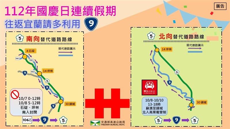 至於國慶日連假則於連假前一日9-24時、首日5-16時與第2日6-15時南向南港系統至頭城路段,以及第2日13-24時、第3日10-24時與收假日9-20時北向宜蘭至坪林路段,車速將低於每小時40公里。
