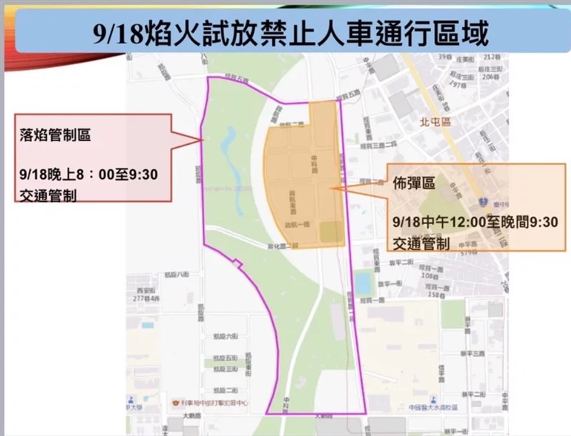 還有「施放(落焰)管制區」則於煙火施放前後進行管制,自晚間8時起至煙火施放結束止,管制路段包含中科路(經貿五路至大鵬路)、凱旋路(僑大八街至凱旋八街)及敦化路(凱旋路至經貿路一段)等,市府指出,管制期間人車均禁止進入,請用路人遵循現場交管人員指揮,配合改道。