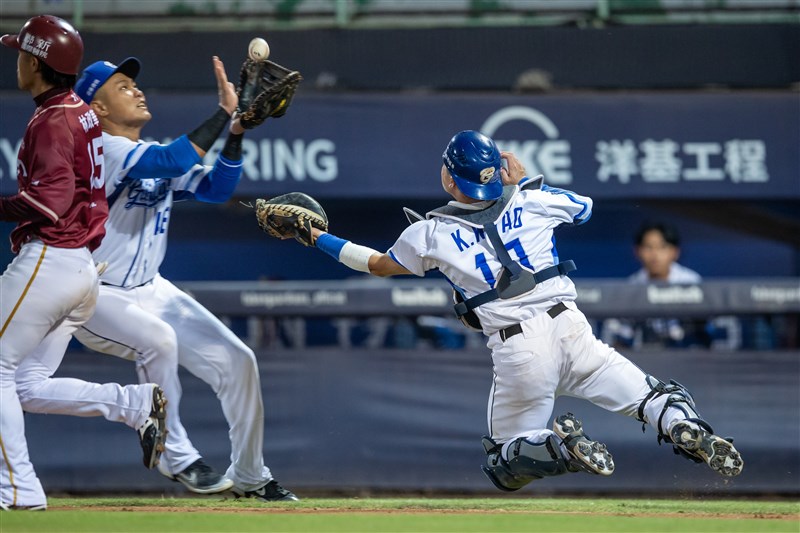 富邦悍將隊一壘手范國宸、捕手姚冠瑋因接球衝撞,姚冠瑋被擔架抬出場,已送醫院觀察,經檢查後有輕微腦震盪,背部肌肉拉傷。圖/季相儒