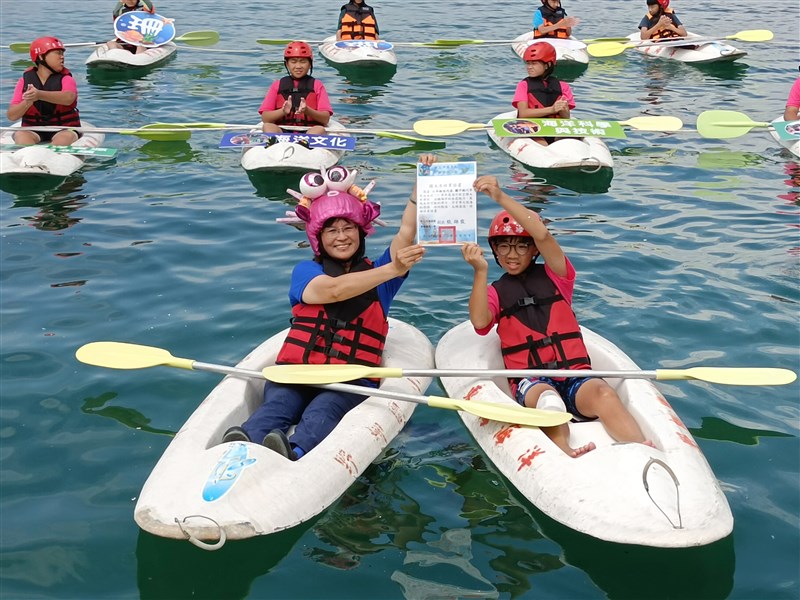 張錦霞校長(左)帶領學生進行獨木舟薪傳畢業典禮。圖/教育局提供