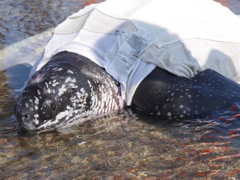 【本報屏東訊】1隻革龜7月在恆春萬里桐擱淺,經搶救不治,海保署今(13)日公布解剖結果,革龜死因是壞死性腸炎,胃內無食物,腸道內有總長達425公分魚線,造成下消化道打摺、扭轉無法正常進食。
