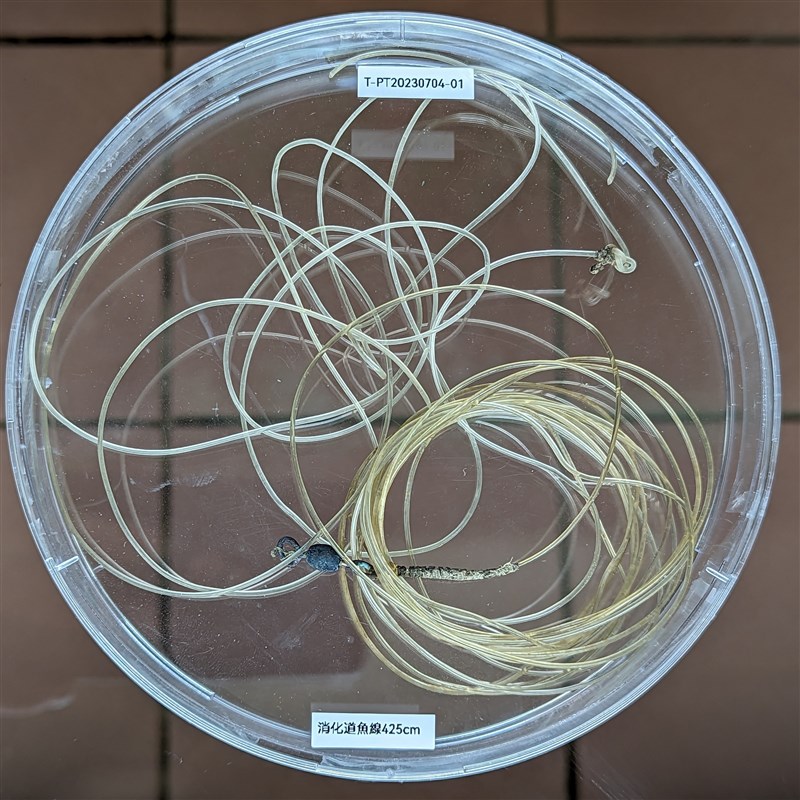 海洋委員會海洋保育署表示,這隻革龜背甲曲線長115.5公分、體重130公斤,7月4日在屏東萬里桐擱淺經救傷收容,不幸在7月5日死亡,海保救援網團隊解剖後發現,牠的腸道內有2條總長達425公分的魚線。