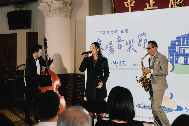 「2023台北市中山堂廣場音樂節」9月15起一連三天晚間登場,今天記者會上金曲歌后舞思愛(中)與台北爵士大樂隊攜手演出。圖/中山堂管理所提供