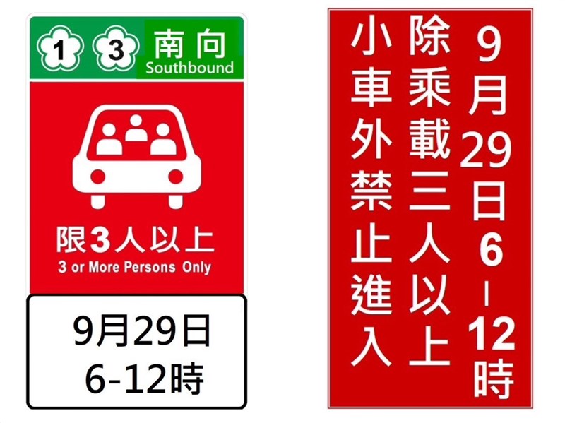 中秋國慶2連假僅隔1周 國道高乘載管制一次看 吳亭頤 |2023.09.13 語音朗讀 1069觀看次 字級 大 中 小 112年中秋連假國道高乘載管制措施。圖/交通部高工局提供 【記者吳亭頤台北報導】中秋節及國慶日連續假期僅間隔1週,交通部高速公路局為分散國道車流,於國1、國3、國5之部分路段及時段實施高乘載管制,將於實施管制之交流道臨近入口前設置彩色圖形化預告告示牌,提醒用路人高乘載管制之日期及時段,並在交流道入口處,設置文字型之紅底白字禁制性告示牌,請用路人多加注意。 左為高乘載管制預告告示牌,右為管制交流道入口處之告示牌。圖/交通部高工局提供高乘載管制預告告示牌為彩色圖形化標誌─以紅底白色圖案呈現管制車種及人數,綠底白字表示管制之路線及方向,再以白底黑字之附牌呈現管制日期及時段,使用路人快速掌握高乘載管制內容。至於管制交流道入口處之告示牌,因須提供作為執法依據,故以傳統紅底白字文字型禁制性告示牌設置,上述標誌將設置於管制交流道之上游路口或路段中,請用路人多加留意,避免因不符高乘載條件而無法進入高速公路。今年中秋節連假,國道實施高乘載管制之時段與路段,中秋連假首日9月29日上午6-12時,國1內湖至頭份(含高架堤頂、環北及機場系統)及國3木柵至香山等路段之各交流道南向入口匝道;9月30日及10月1日下午13-18時,國5蘇澳至頭城之各交流道北向入口匝道,結束時間視交通狀況機動調整。接續之國慶日連假,10月7日上午6至12時, 國1內湖至頭份(含高架堤頂、環北及機場系統)及國3木柵至香山等路段之各交流道南向入口匝道;10月8至10日下午13至18時,國5蘇澳至頭城之各交流道北向入口匝道,結束時間視交通狀況機動調整。因高乘載管制須為乘載一定人數以上之小型車或規定之車輛方可進入國道,故實施管制之交流道前方將有員警駐守,請用路人配合相關規定,並於接近管制區時,依警方指示循序漸進。112年國慶日連假國道高乘載管制措施。圖/交通部高工局提供 前一篇文章 停車場應按比例設置充電位 且須投保意外險 下一篇文章 出口衰退抑制獎金 前7月實質總薪資年減0.67% 熱門新聞 01祖厝大變身 王榮文打造農夫美術館2026.03.3102苗栗漁港冒藍眼淚 縣府將檢測水質2026.03.3103明德水庫蓄水量僅27% 今起供4停42026.04.0104【讓愛自由】纏繞與獨立之間2026.04.0205新生首次到校2026.04.0206星雲大師靈骨分燈日本 法燈長明2026.04.0107星雲大師靈骨分燈泰國 化益世人2026.04.0208東京櫻花滿開2026.04.01099公尺高恐龍 現身澄清湖2026.04.0110佛光會理監事會議 佛光精神深耕全球2026.03.31 訂閱電子報 台北市 天氣預報 台灣一週天氣預報 相關報導 浪漫那瑪夏 賞螢採果樂降雨兩樣情 南部水庫沒解渴玉山4月雪拳擊亞錦賽 陳念琴保底銅牌 桌球世界盃 林昀儒暌違7年闖4強高雄貓站長 「蜜柑」 6歲了全台黑琵數量 創新高 作者其他文章中斷15年 阿里山林鐵7/6全線通車台鐵加祿站 旅客成長百倍中職統一獅 奪第17座季冠軍莫莫尼:叛逆少年 渴望被聆聽、被理解塞爾蒂克捧第18冠 超越湖人登頂NBA台鐵貨運新車 R200報到