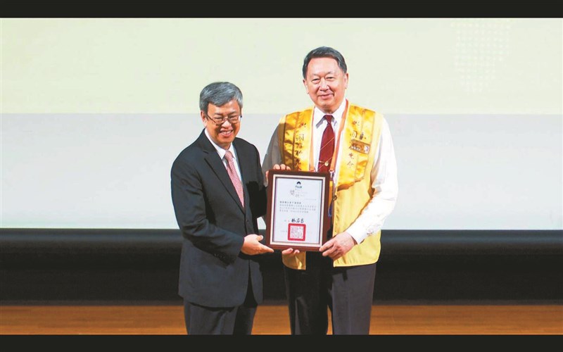 國際佛光會中華總會獲最高類別「金質獎」殊榮,總會長趙怡(右)從行政院長陳建仁(左)手裡接下獎牌。圖/人間衛視提供
