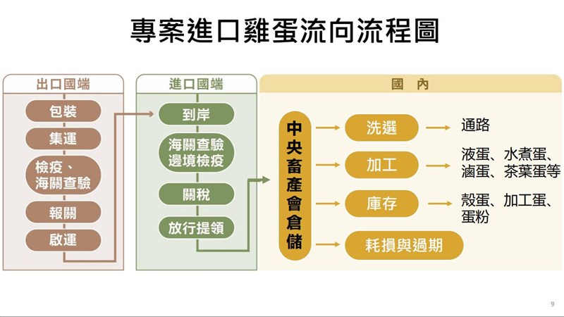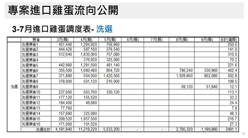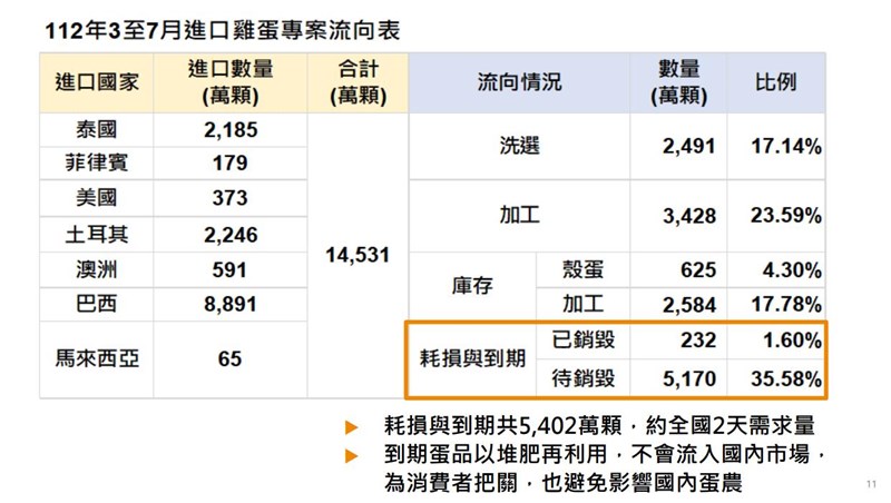 農業部公布專案進口雞蛋流向 將封存銷毀5402萬顆 |2023.09.16 語音朗讀 1449觀看次 字級 大 中 小 進口蛋爭議延燒,農業部長陳吉仲16日下午主持臨時記者會時指出,不論是洗選、加工業者等都應依規範來處理,後續將與衛福部、地方政府合作稽查,違者一定依法辦理。圖/中央社 【本報台北訊】進口雞蛋事件延燒,不僅蛋商盒裝進口雞蛋「誤標效期」,又有蛋商將進口雞蛋混入國產雞蛋,卻標示「國產」,外界不斷要求農業部追查即期蛋去向,也希望可以標示清楚,但農業部不回應;今(16)日召開記者會,公布進口雞蛋流向。農業部今日公布3到7月專案進口雞蛋流向,從3到9月間由中央畜產會調度給洗選業者、加工業者和代工業者,其中洗選業者洗選後,會以殼蛋方式上架各通路販售。加工業者則是將進口雞蛋加工成液蛋、水煮蛋、滷蛋等方式販售;其他則是由畜產會請代工業者加工後轉為畜產會的庫存。農業部公布專案進口雞蛋流向。圖/農業部提供農業部表示,整體3到7月專案進口雞蛋共進口1億4千多萬顆,約是全國6天的需求量,自泰國、菲律賓、美國、土耳其、澳洲、巴西和馬來西亞等國進口。進入洗選場後,上架通路販售的殼蛋共2491萬顆、占比17.14%;加工共3428萬顆、占比23.59%;庫存包含殼蛋和加工蛋品共有3209萬顆、共22.08%。包括全國販售通路,如量販店、賣場、超市、超商及市場等進行雞蛋查核,預計查核4000件。圖/黃仲裕農業部指出,為確保消費者需求及穩定國內雞蛋供應,在國內雞蛋產量尚未百分之百恢復、加上可預期的疫病問題,農業部為此建立滾動安全庫存。農業部表示,但是6到7月雞蛋需求量降低,庫存中陸續出現到期蛋品,加上洗選、運輸的耗損,耗損與到期的進口雞蛋共5402萬顆,占比共37.18%,約是全國2天雞蛋的需求。但這些到期蛋品都有再利用,已有232萬顆送往堆肥、待銷毀者有5170萬顆,已全數封存,不會流入國內市場。農業部公布專案進口雞蛋流向。圖/農業部提供農業部表示,所有專案進口雞蛋洗選後上架的標示,均要依照出口國來源場標示的有效期限,農業部將庫存進口雞蛋調度給洗選業者時,皆有告知該批雞蛋的有效期限。針對近日出現洗選業者錯誤標示有效期限情事,業者已將錯誤標示蛋品全面從通路端下架,為清查是否還有標示錯誤的蛋品,農業部將與衛福部和地方政府合作執行聯合稽查,違者一定依法辦理。農業部公布專案進口雞蛋流向。圖/農業部提供 前一篇文章 T1/太陽氣不過再發聲明 批聯盟藐視球團努力 下一篇文章 舉重/世錦賽意外落C組 郭婞淳亞運與腰傷共處 熱門新聞 01【院線片】《陽光女子合唱團》淚水與歌聲創造票房紀錄2026.03.1402飛天白馬秀 燈會大亮點2026.03.1503美軍轟 伊朗石油命脈哈格島 2026.03.1504店貓上班摸魚睡翻 萌樣逗樂網友2026.03.1805銀行鑑價下修1成 購屋頭期款大增2026.03.1606室內拔河世錦賽 我女子隊奪4連霸2026.03.1507黃仁勳推輝達版龍蝦 進軍太空2026.03.1808經典賽4強 美國對決多明尼加2026.03.1509三好教育進校園 扎根成為校園文化2026.03.1710草間彌生 隱形生命2026.03.16 訂閱電子報 台北市 天氣預報 台灣一週天氣預報 相關報導 藍白拍板 聯合競選治理方向中選會人事 卓:提不同人選賴:台海和平 世界安全要素反制飛彈 防部列防禦重點2026藍白合 全民調獲共識中選會人事 主委游盈隆過關