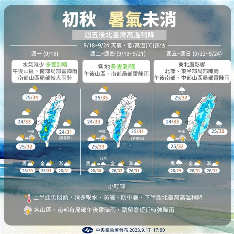 溫度部分,葉致均提到,未來一周高溫仍有攝氏31至34度左右,22日起雖轉為東北風,但僅北部、東北部地區高溫略降1、2度,整體影響不大。