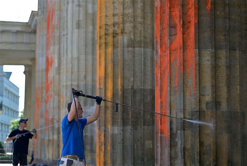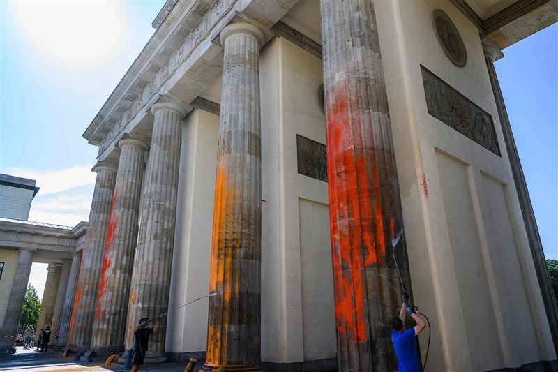 抗議氣候變遷 柏林地標布蘭登堡門被噴漆 |2023.09.18 語音朗讀 738觀看次 字級 大 中 小 為抗議氣候變遷,德國首都柏林地標布蘭登堡大門立柱17日被社運人士噴灑黃色和橙色油漆。圖/法新社 【本報綜合外電報導】德國首都柏林地標布蘭登堡大門的立柱17日被抗議氣候變遷的社運人士噴灑黃色和橙色油漆。他們力促於2030年之前停止使用化石燃料的訴求。路透報導,柏林警方在舊稱推特、已經更名的社群平台X上指出:「所謂『最後一代』(Last Generation)成員今天上午用從滅火器中噴出的橘色油漆,對布蘭登堡大門(Brandenburg Gate)東側的立柱噴灑。」維護人員清理石柱噴漆中。圖/法新社警方並表示,注意到抗議人運用液壓升降裝置,警方阻止他們攀爬這處地標建物,並且當場逮捕所有14名成員,對這起財產毀損案件展開調查。總部設在德國的「最後一代」和英國環保團體「攔住石油」(Just Stop Oil)都是橫跨全歐洲的公民抵抗運動聯盟A22的成員。「最後一代」在X平台上傳噴漆時的照片指出:「除非提倡轉向,否則我們不會停止抗議。我們最晚必須於2030年之前停止使用石油、天然氣和煤炭。」圖/法新社 前一篇文章 烏克蘭前線傳捷報 收復巴赫姆特附近要衝 下一篇文章 利比亞洪患罹難人數下修 聯合國:至少3958人遇難 熱門新聞 01【詩】啤酒與冰淇淋 2026.02.2702發現世界最早花椒?2026.02.2503【遇見荷】眠夢風吹雪2026.02.2504台北道場行春 蔣萬安為市民祈福2026.02.2605大馬首相署開齋晚宴 佛光山受邀出席 2026.02.2506好苗子獲頒獎學金 新年新希望2026.02.2507新馬寺供佛齋天 重現千年佛教盛況2026.02.2508抄經、叩鐘年味滿懷 北卡佛光山鬧元宵2026.02.2609日本大阪春節祭 佛光人設攤結緣2026.02.2510惠中寺舊址熄燈 新址再啟弘法扉頁2026.02.27 訂閱電子報 台北市 天氣預報 台灣一週天氣預報 相關報導 繽紛花燈迎元宵黎巴嫩參戰襲以 中東情勢更險峻戰術奇襲 美以對伊改白天動武觀燈賞泉慶元宵米蘭電車出軌撞餐廳 2死索道春遊 滑翔賞花