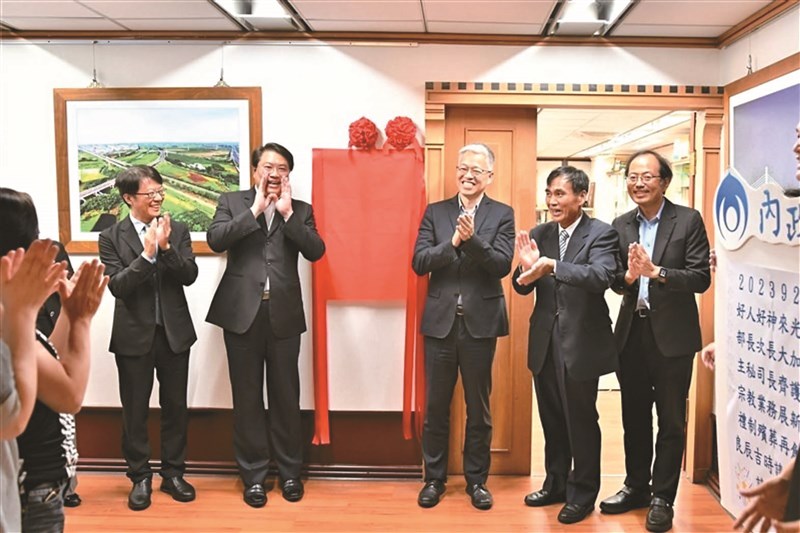 內政部長林右昌(左二)與宗教及禮制司長林清淇(右二),昨天共同揭牌合影。