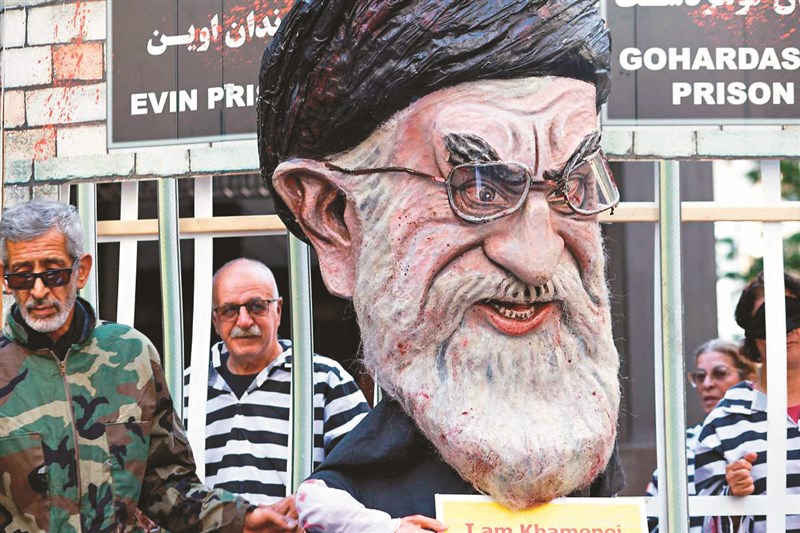 十九日在聯合國總部大樓外,示威民眾裝扮成政治犯,抗議伊朗政權。圖/法新社