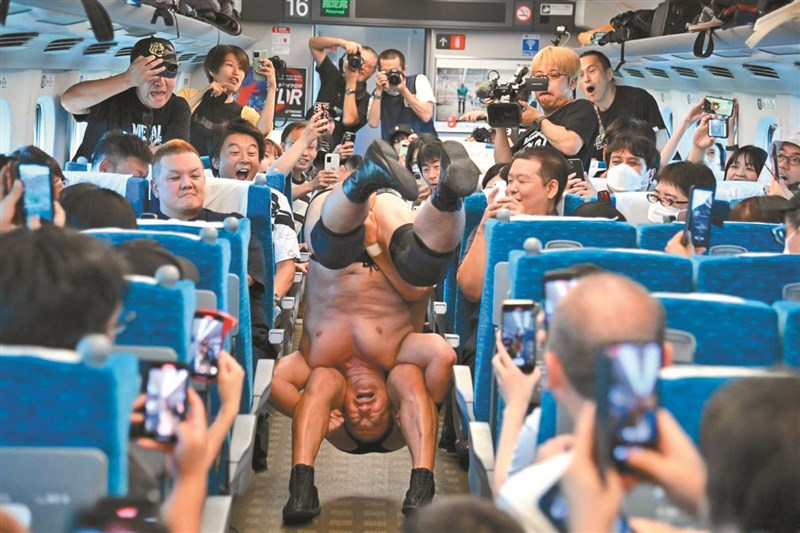 日本職業摔角在新幹線列車上,首次舉辦比賽,吸引許多人近距離觀賞。圖/取自網路