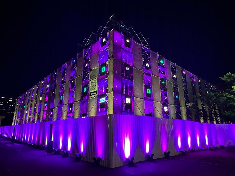 文化策展主展區之一空總當代文化實驗場,以古蹟修復中的工地鷹架轉換為聲光裝置藝術,以科技裝置帶入表演藝術匯演。戰情大樓並運用色彩與燈光變化,展現未來科幻感。圖/記者曹麗蕙