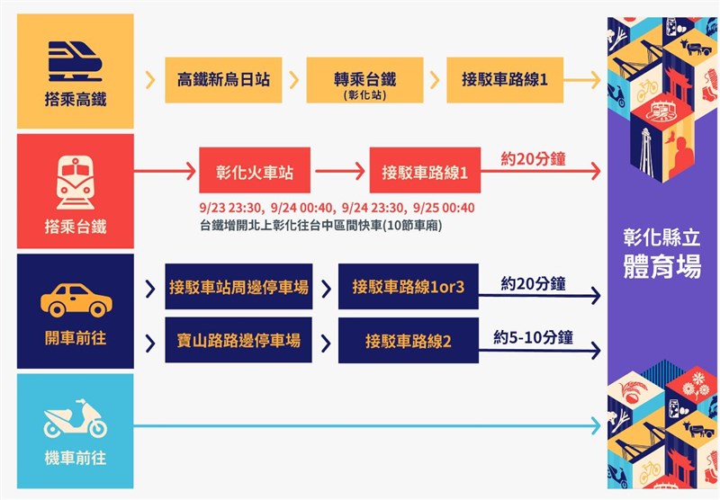 警方指出,縣府提供3條免費交通接駁車路線,民眾可在彰化火車站、寶山路以及南興國小搭公車前往體育場,白天班距約20分鐘、晚間約5至10分鐘。