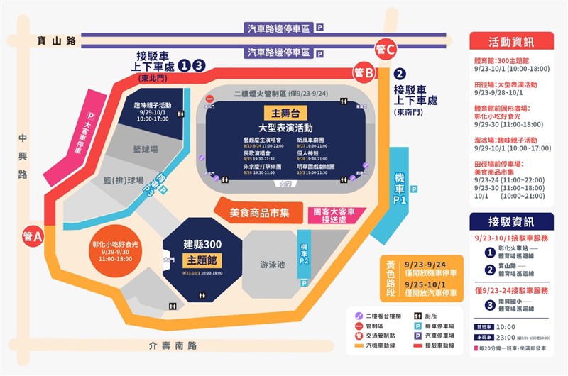 彰化縣體育園區23日舉辦博覽會和演唱會,園區周邊的中興路與介壽路口、師大路與寶山路口等路段交管,上午8時至晚間11時禁止汽車進入。圖/取自2023彰化博覽會官網