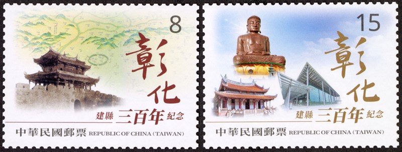 【記者吳亭頤台北報導】彰化縣今年適逢建縣三百年,中華郵政公司將於明(23)日起發行「彰化建縣三百年紀念郵票」1套2枚,面值分別為8元、15元,另配合郵票發行,中華郵政特印製首日封、貼票卡、護票卡及活頁集郵卡(含護卡套)各1批,已於21日發售。