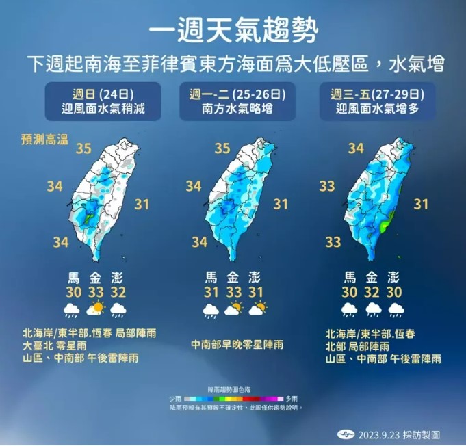 下周三至下周日,菲律賓東邊至南海一帶為低壓帶,除了活躍之外,也因較靠近台灣,水氣變多,並順著東北風風向過來,以致午後雷陣雨範圍擴大,降雨程度亦轉趨明顯,以各地山區、中南部平地為降雨範圍,以及迎風面的北部、東半部降雨機率也增加。