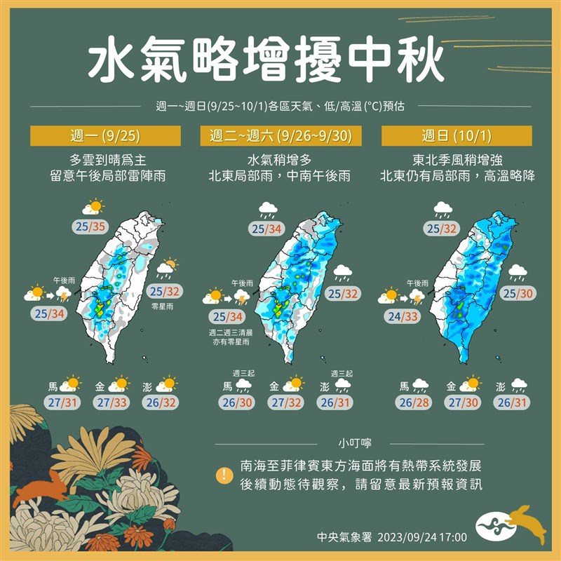 他表示,30日晚間至10月3日受東北季風及低壓帶偏北風至東北風影響,30日晚間至10月1日基隆至東北角及宜蘭有零星短暫雨,1日午後北部、宜花及南投以南山區有局部短暫雨。