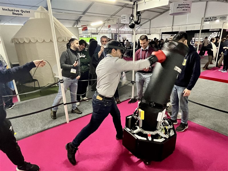 北科大跨校團隊合作「易動拳靶」獲邀參展Laval Virtual 2023,吸引眾多外賓揮拳體驗。圖/北科大提供