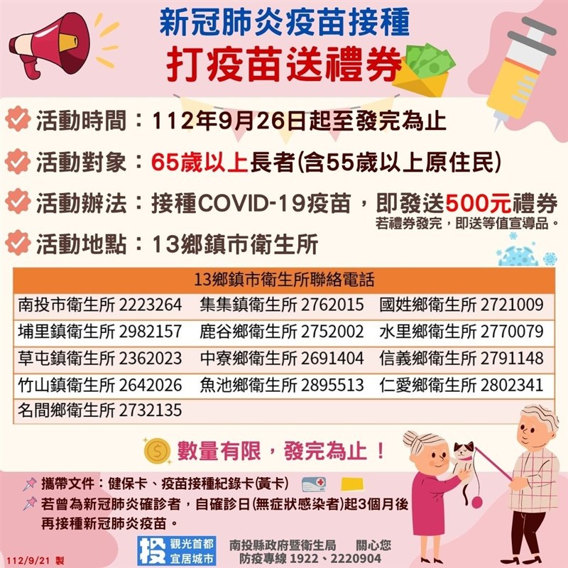 9月26日起莫德納XBB.1.5疫苗開打,南投縣府為鼓勵65歲以上長者、55歲以上原住民施打新冠疫苗,接種就送500元禮券或等值禮品。圖/南投縣政府衛生局提供