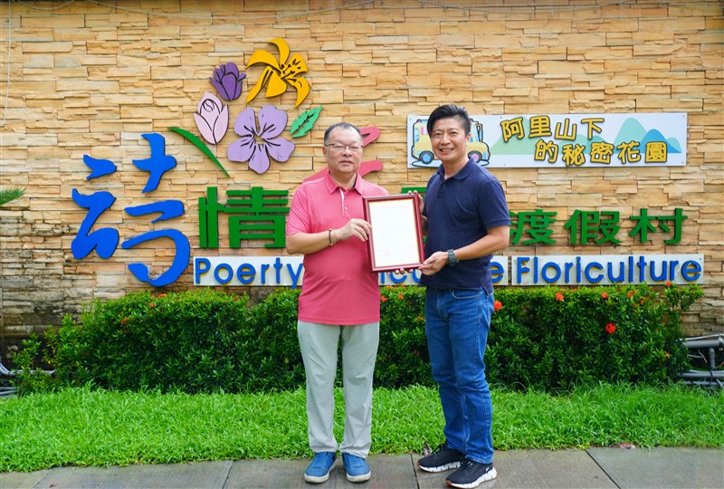 南華大學文化創意事業管理學系執行長林倫全(右)與嘉義縣中埔鄉詩情花園渡假村總經理攜手產學合作。圖/南華大學