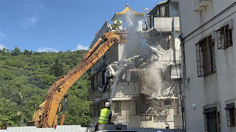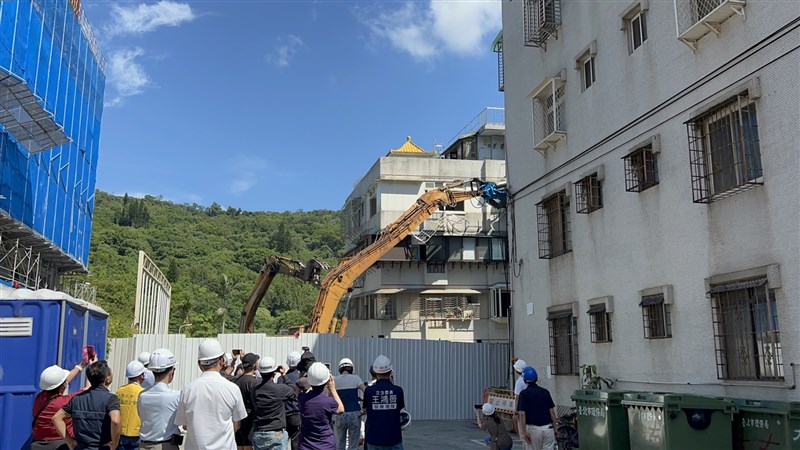 北市建案「基泰大直」施工不慎釀周邊民宅坍陷,25戶受損房屋今上午完成防護工作,26日10點20分左右開始拆除。圖/林佳彣