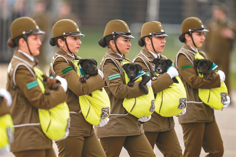 智利今年的閱兵儀式總共有七十六隻軍犬參加,一部分成年的軍犬由領犬員以牽引繩引領進場,另一部分年幼的軍犬,則由領犬員抱著或背在黃色後背袋中進場,小狗探頭探腦好奇可愛的模樣成為全場焦點。其實狗狗們於二○一七年就首度亮相,從那之後就成為每年智利閱兵典禮的超級明星,擄獲觀禮民眾的心。
