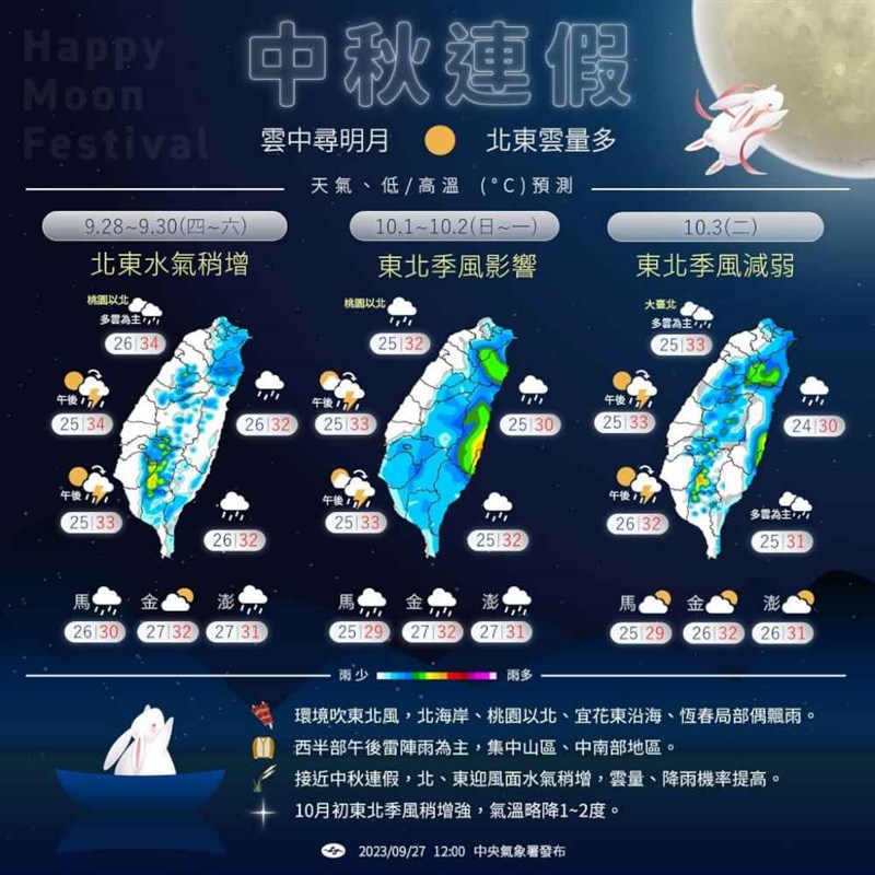 黃恩鴻說,10月1日入秋後首波東北季風報到,一樣迎風面要留意降雨外,溫度方面北台灣高溫31到32度降到28度跟29度,低溫則落在25度到26度。10月3日後東北季風減弱,水氣減少,各地轉為多雲到晴,東半部跟恆春半島有零星短暫陣雨。