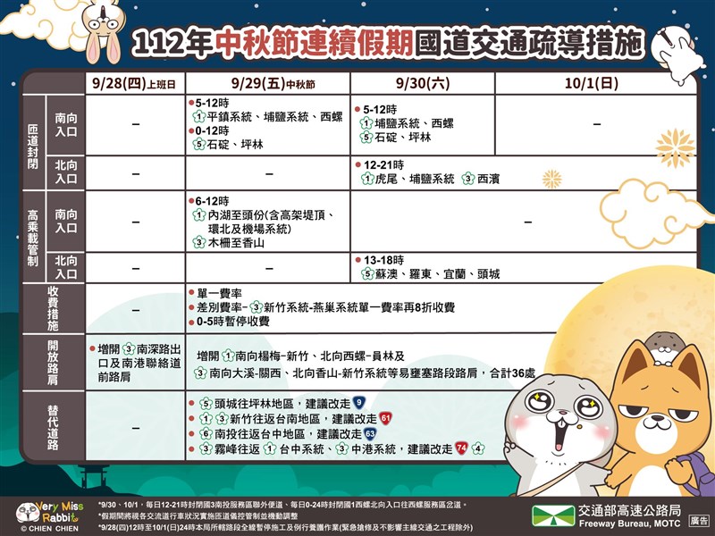 中秋連續假期國道交通疏導措施。圖/取自高速小飛力臉書