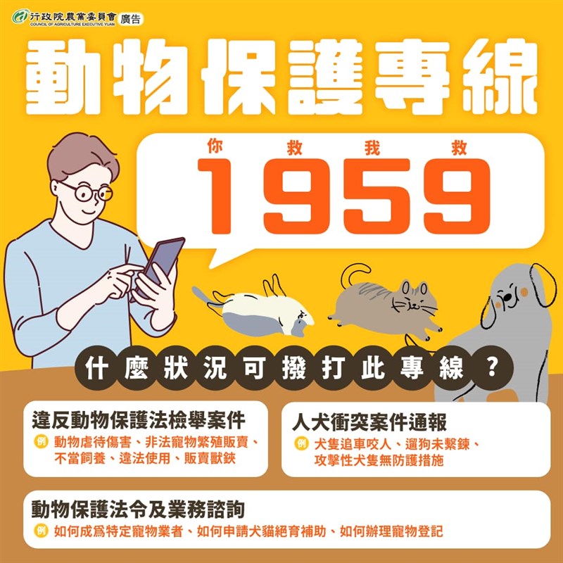 新竹縣動保所長彭正宇表示,1959專線服務的目標是為民眾提供各種與動物保護相關諮詢和協助,服務範圍包括動保法、動物絕育、動保法違法案件、動物捕捉、狂犬病疫苗、寵物業及動物救援案件等。