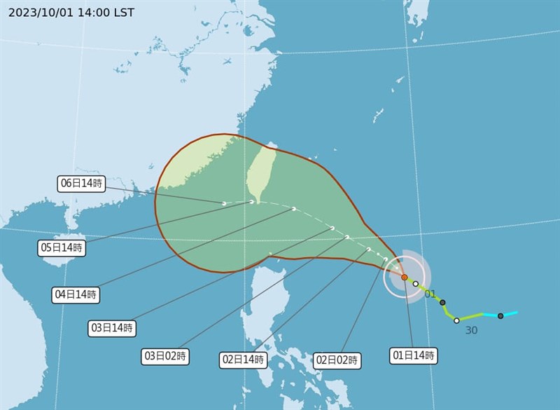 小犬接近台灣時可能會達中颱強度,由於有持續向北的趨勢,目前日本氣象廳預測小犬有機會中心登陸台灣,但各國模擬仍有落差,須再觀察;就目前資料預測,3日清晨至上午可能會發布海上颱風警報,陸上警報可能是3日下午至晚上。
