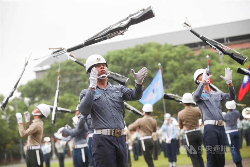 國防部三軍樂儀隊將於10月10日國慶大典演出,3日則在憲兵指揮部進行演練,圖為拋槍。圖/中央社