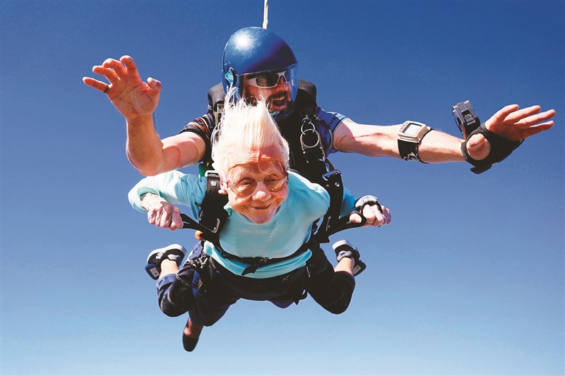 【本報綜合外電報導】美國芝加哥一百零四歲人瑞霍夫納(Dorothy Hoffner)說:「年齡只是一個數字。」她日前在於伊利諾伊州渥太華的芝加哥高空跳傘中心(Skydive Chicago airport),自一萬三千五百呎(約四千一百一十四公尺)的高空一躍而下跳傘成功,創下世界最高年齡的跳傘紀錄。