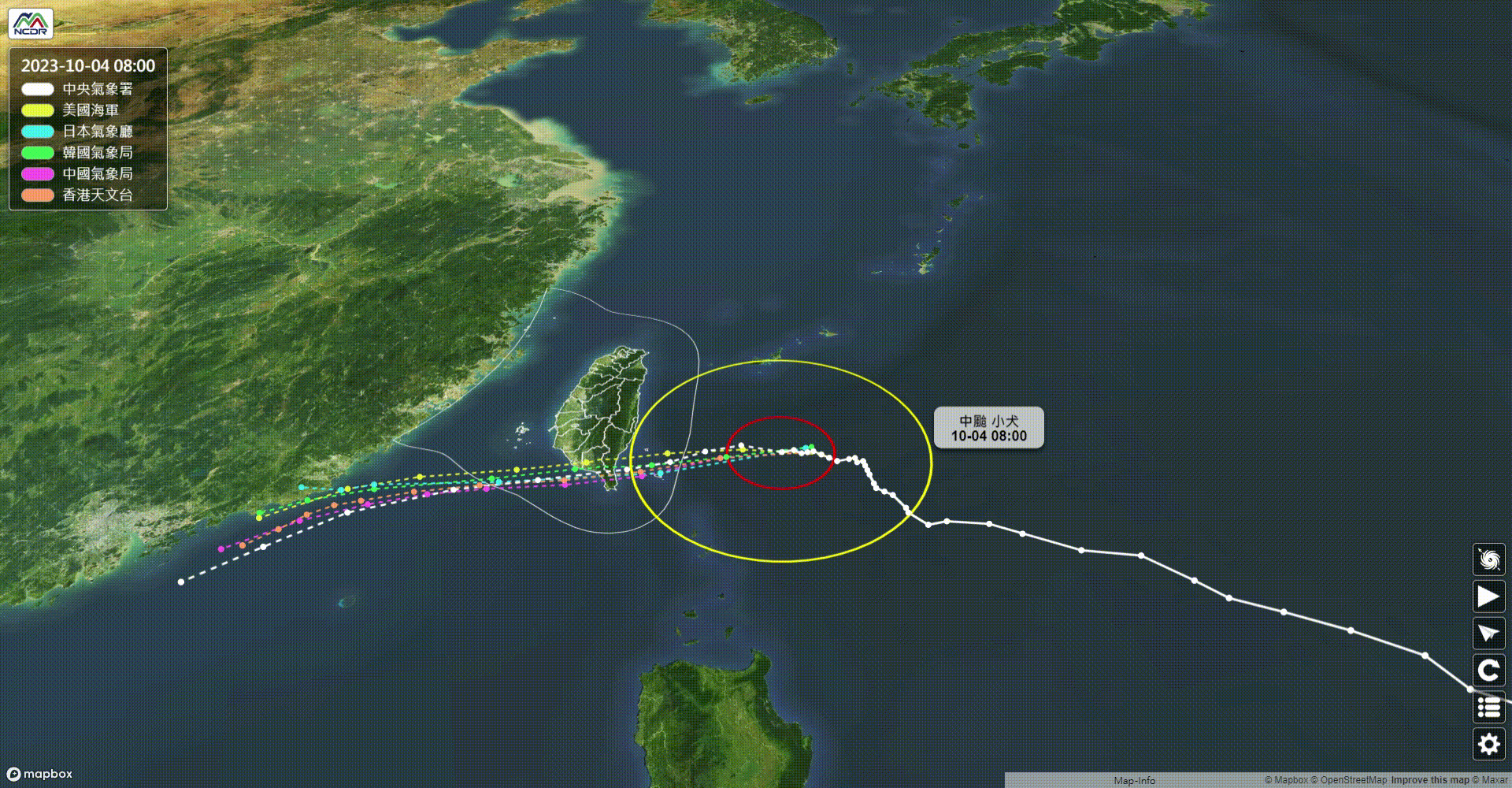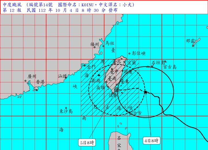 根據最新資料顯示,第14號颱風小犬中心目前在鵝鑾鼻東方海面向西移動,暴風圈已進入東半部近海,對宜蘭、花蓮、台東、南投、新竹以南及恆春半島將構成威脅。