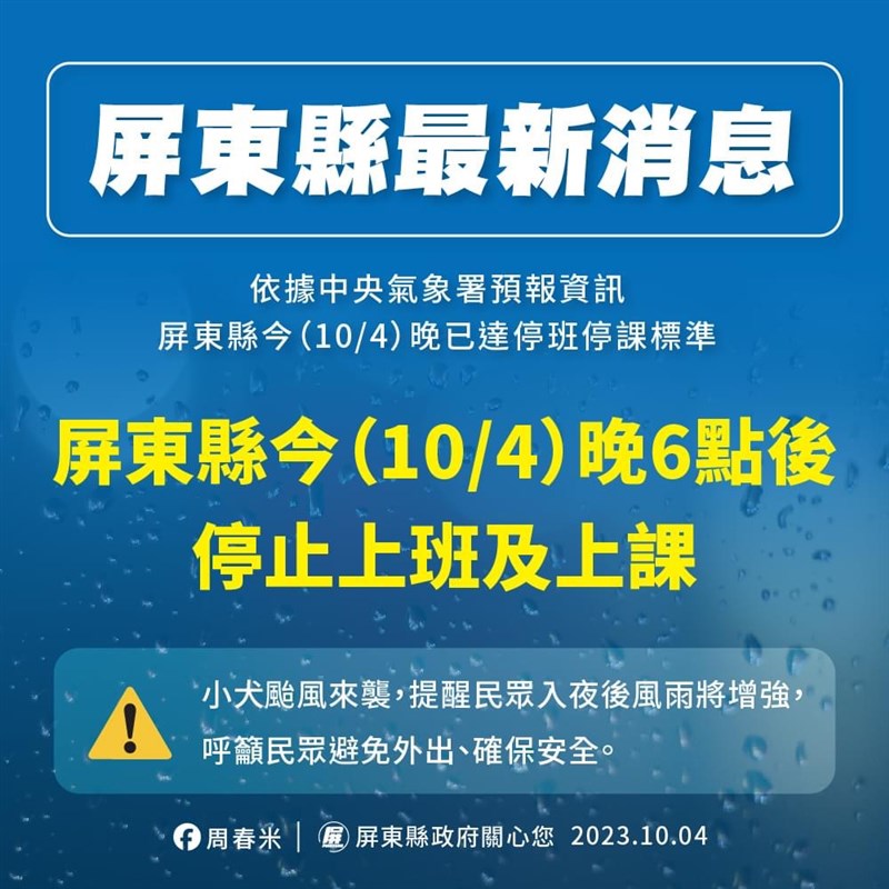 快訊!小犬來襲 南高屏18時起停班課 全台資訊一覽 |2023.10.04 語音朗讀 463觀看次 字級 大 中 小 小犬颱風來襲,中央氣象署持續發布海上陸上颱風警報,隨著颱風逐步進逼,為維護民眾安全及準備各項應變作為,雲林縣、嘉義縣、台南市、高雄市及屏東縣陸續宣布4日晚上停止上班上課。圖/資料照片 【本報綜合報導】小犬颱風來襲,中央氣象署持續發布海上陸上颱風警報,隨著颱風逐步進逼,為維護民眾安全及準備各項應變作為,雲林縣、嘉義縣、台南市、高雄市及屏東縣陸續宣布4日晚上停止上班上課。雲林縣政府宣布,依據中央氣象署預報資訊,雲林今晚風力預測陣風達8至9級,且入夜後颱風影響漸增,沿海地區預估將有10級以上陣風,達停班停課標準。為維護民眾安全,晚上6點起停止上班、上課。高雄市政府表示,根據中央氣象署資訊,今晚高雄市風力預測,最大陣風達8至9級,受颱風的風場及管道效應影響,評估沿海地區會將出現10級以上陣風,已達停班停課標準。為維護民眾安全及準備各項應變作為,故高雄市今晚6點起停止上班、停止上課。台南市政府宣布今晚六點起停班停課,明日情況會依最新資訊盡速公佈。黃偉哲臉書表示,依據中央氣象局資料顯示,受小犬颱風影響,風雨自下午起漸增,鑑於市民安全,台南市政府宣布今(10/4日)下午6點起停止上班、停止上課。圖/台南市政府提供屏東縣政府依據中央氣象署預報資訊,屏東縣今(4)日晚上已達停班停課標準,屏東縣今晚6時起停止上班、上課。縣府提醒民眾,入夜後風雨將逐漸增強,呼籲民眾避免在外不必要的逗留及外出,以確保安全。圖/取自周春米臉書各縣市10月4日停班、停課資訊基隆市:正常上班、正常上課。台北市:正常上班、正常上課。新北市:正常上班、正常上課。桃園市:正常上班、正常上課。新竹市:正常上班、正常上課。新竹縣:正常上班、正常上課。苗栗縣:正常上班、正常上課。台中市:正常上班、正常上課。彰化縣:正常上班、正常上課。南投縣:正常上班、正常上課。雲林縣:4日晚上6時起停止上班、停止上課。嘉義市:正常上班、正常上課。嘉義縣:4日晚上停止上班、停止上課。台南市:4日晚上6時起停止上班上課。高雄市:4日晚上6時起停止上班上課。屏東縣:恆春半島4日下午已達停班停課標準,包括恆春、車城、滿州、枋山、牡丹、獅子等六鄉鎮,4日下午停止上班上課。屏東縣其餘地區4日晚上6時起停止上班上課。宜蘭縣:正常上班、正常上課。花蓮縣:正常上班、正常上課。台東縣:蘭嶼鄉、綠島鄉4日停止上班、停止上課。其餘地區4日上午正常上班上課;自下午起停止上班上課。澎湖縣:停止上班、停止上課。連江縣:正常上班、正常上課。金門縣:正常上班、正常上課。 前一篇文章 桃捷轉虧為盈宣布加薪 員工拍手歡呼 下一篇文章 公費留學考試7日登場 錄取名額共計141人 熱門新聞 01【遨遊藝事】 威尼斯沉船書店2025.12.2902【獻給動物朋友的詩】 最可愛的動物詩路2025.12.2503【中醫專欄】 中醫防失智之道2025.12.2704以法相聚 佛光山員義工歲末聯誼2025.12.2405【寰宇采風】京都最溫柔的秋色:紅葉永觀堂2025.12.2606台北道場歲末聯誼 感謝義工同行菩薩道2025.12.2707社論--悲憐天下父母心2025.12.2508南瓜籽紅豆黑芝麻 含天然助眠營養素2025.12.2609南天寺英文佛學營 佛青培養內在力量2025.12.2410奧斯汀佛光人 感謝警消守護2025.12.24 訂閱電子報 台北市 天氣預報 台灣一週天氣預報 相關報導 賴上台 陸4度圍台軍演雙城論壇 蔣暢談民國及民主大肚和美跨橋 力拚明年通車停砍年金案 將釋憲、暫時處分桃機三航廈北廊廳 亮麗啟用台電2026招考 起薪逾4萬元