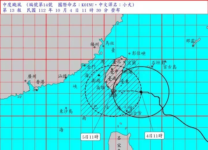 【本報台北訊】中颱小犬進逼,暴風圈今(4)日上午觸陸,陸警區域擴大,除宜花東、新竹以南等,再增澎湖,豪雨特報區域也將再擴,中央氣象署指出,首當其衝的東半部地區,今天雨勢愈晚愈大,各地沿海風浪強勁,且小犬颱風的「不規則運動」亦為路徑埋變數,目前估颱風中心明天可能通過台東南端陸地至巴士海峽一帶。